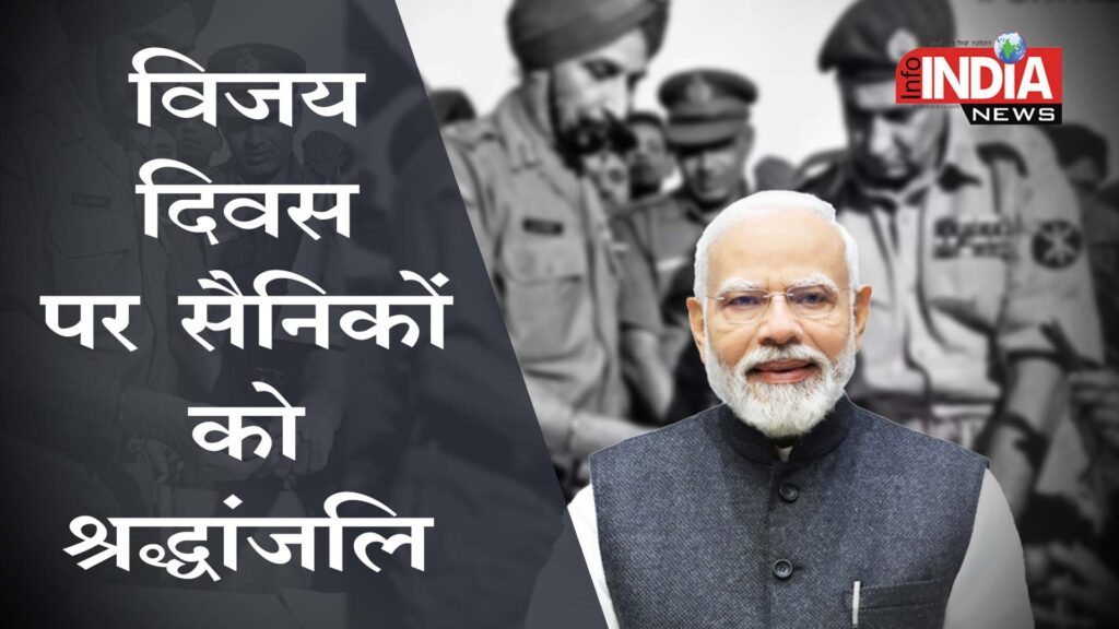 Info India News I प्रधानमंत्री ने विजय दिवस पर वीर सैनिकों को श्रद्धांजलि अर्पित की प्रधानमंत्री नरेन्द्र मोदी ने विजय दिवस के अवसर पर उन वीर सैनिकों को याद किया जिनके साहस और बलिदान ने 1971 में भारत को ऐतिहासिक…